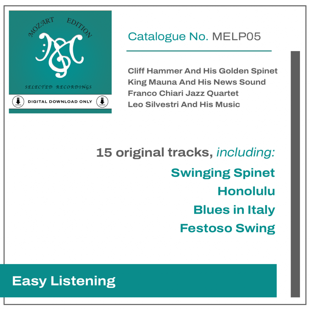 Published inMELP05 (Digital Download only) Cliff Hammer and His Golden Spinet; King Mauna and His News Sound; Franco Chiari Jazz Quartet; Leo Silvestri and His Music